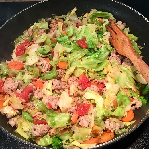 - Faites revenir la viande de porc 5 minutes puis ajoutez le reste du beurre, le mélange haché, le chou taillé grossièrement, les carottes, sel et poivre .. poursuivre la cuisson 5 minutes.