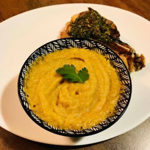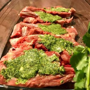 Avec la saveur sucrée de cette purée j’ai de suite eu envie de préparer de l’agneau ou du mouton .. Mon choix c’est porté sur des côtelettes d’agneau que j’ai acheté dans une boucherie halal .. Je les cuites rôties au four avec une croute * de coriandre fraiche .. waouh c’est un délice ! (* coriandre mixée avec du beurre salé, de l’ail et des graines de courge)